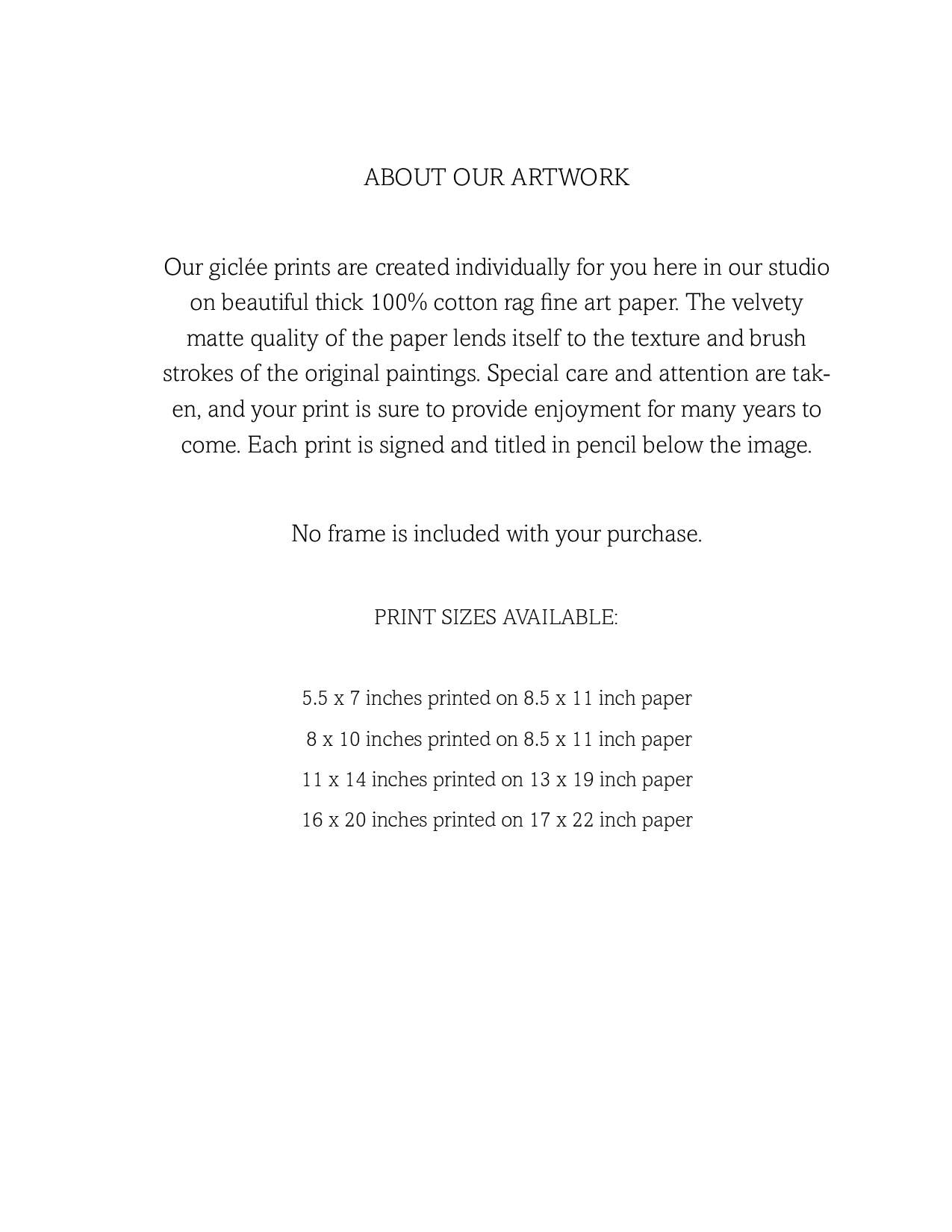 Each print is carefully inserted in a clear cello sleeve and shipped in a rigid mailing envelope or a mailing tube, depending upon the print size.