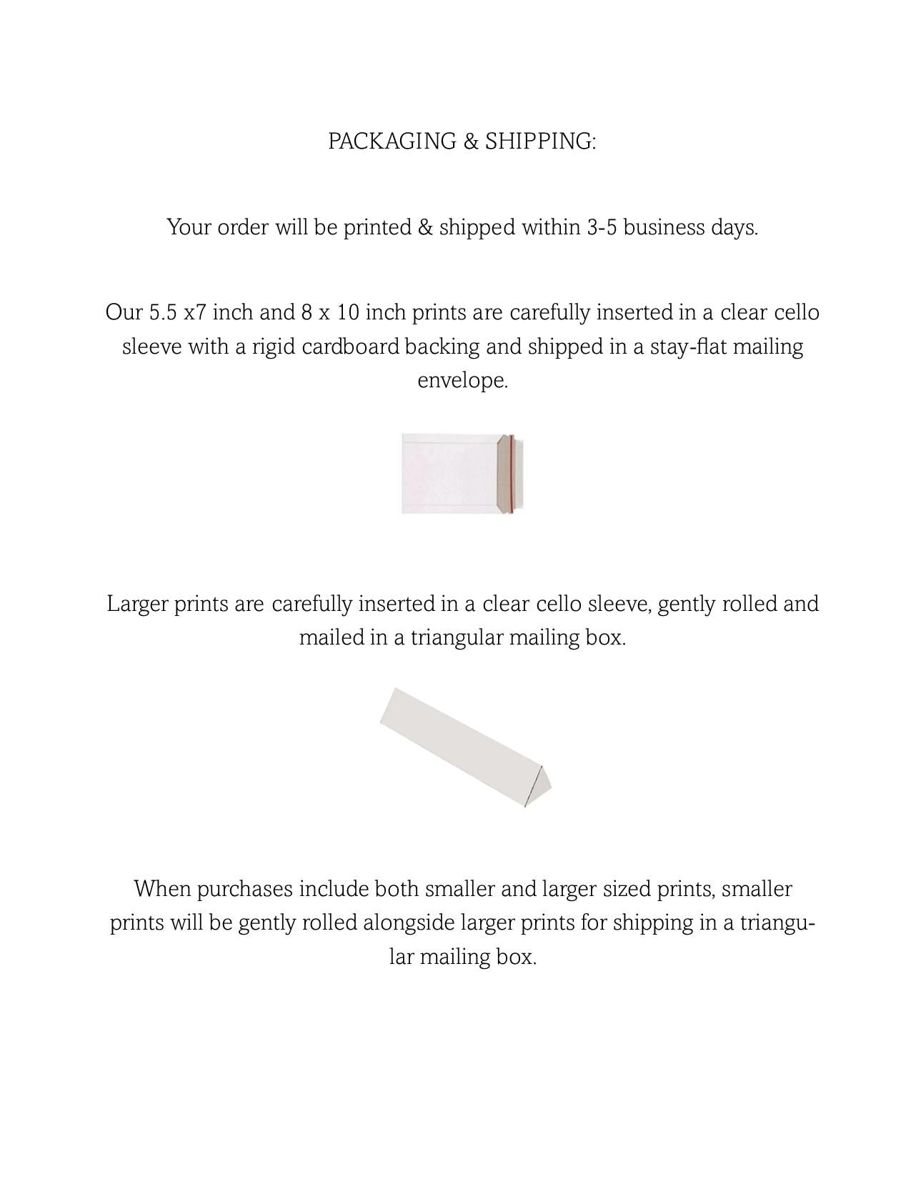 When purchases include multiple prints of varying sizes, smaller prints will be gently rolled alongside larger prints for shipping.
